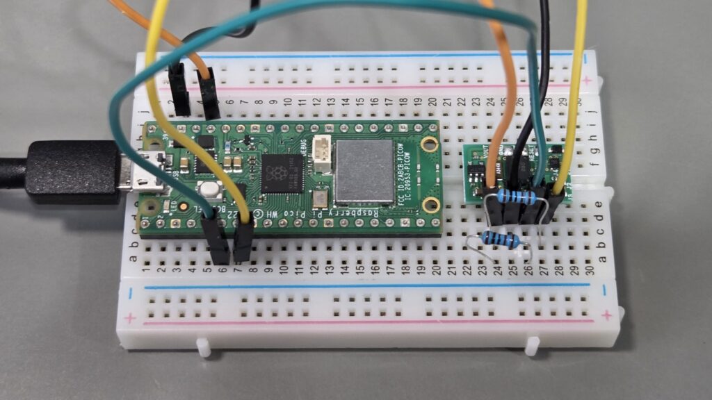 そのため、信号線はプルアップ(3.3Vと抵抗で接続)されている必要があります。しかし、秋月電子で販売されているモジュールにはこのプルアップ抵抗が搭載されていません。