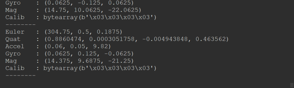 BNO055から9軸+各種姿勢データとキャリブレーションデータを取得して表示するプログラムはこちら。